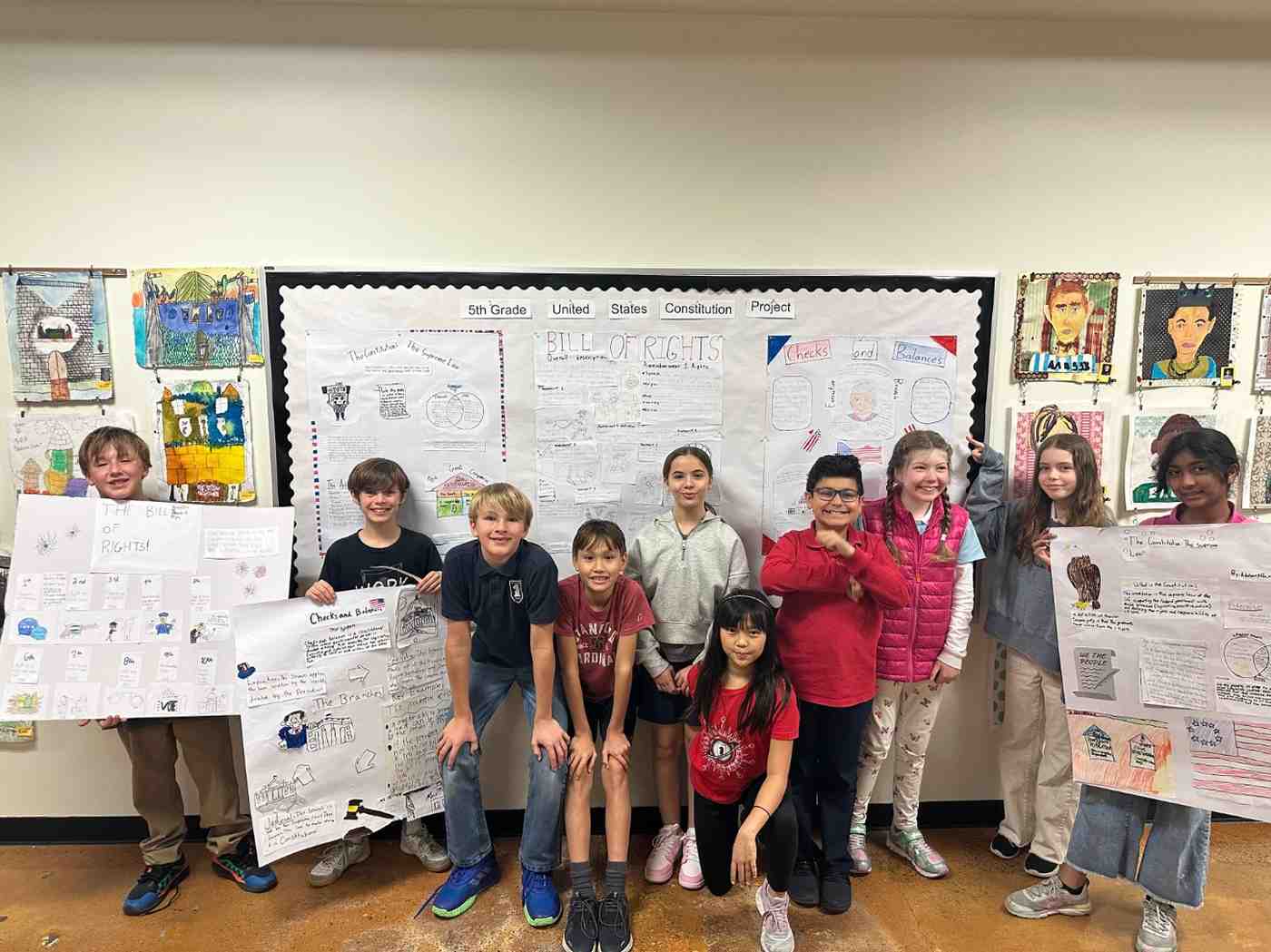 Here’s a look at some of our fifth graders at Paragon Prep proudly sharing their U.S. Constitution projects. Working in small groups, students explored key elements of the Constitution and brought their learning to life through three thoughtfully designed posters. One group focused on the structure of the Constitution, highlighting the Preamble, the seven Articles, and the Great Compromise. Another group created a detailed Bill of Rights poster, while a third explained the system of Checks and Balances and how it shapes our government today.